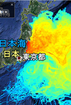 北海道の魚がかなりの汚染をしているので海洋の流れを計算しているデータを調べました(読者の方のご協力あり)。その結果、この図のように海流とは別にかなりの量の放射性物質が北海道に流れた形跡もあります(図で海の色が濃く変わっているところが放射性物質が多く流れた場所です)。この計算はコンピュータの計算ですからまだ本当かどうかわかりませんし、が外国ものなので、是非、日本の海洋関係者が実際の測定値を出して、解析してくれることを期待しています。