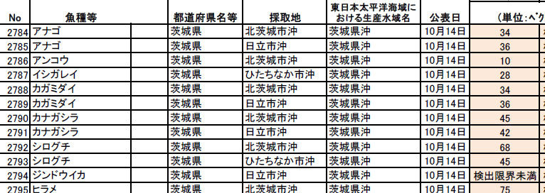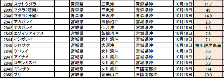 8月から10月にかけての太平洋側のサカナの汚染状態について整理をしてみたいと思います。基本的には状況は変わっていません。結論としては、次のようになるようです(太平洋岸の北海道から静岡まで)。