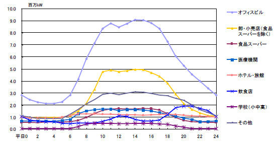 このグラフは夏場の電気をどのような産業が使っているかを示したものだが、なんと言ってもオフィスがダントツで、次が小売業というところだ。つまり、巨大なビルを作り、そこに本社があって社長がいることもあり、ガンガン冷やしているというのが現状である。