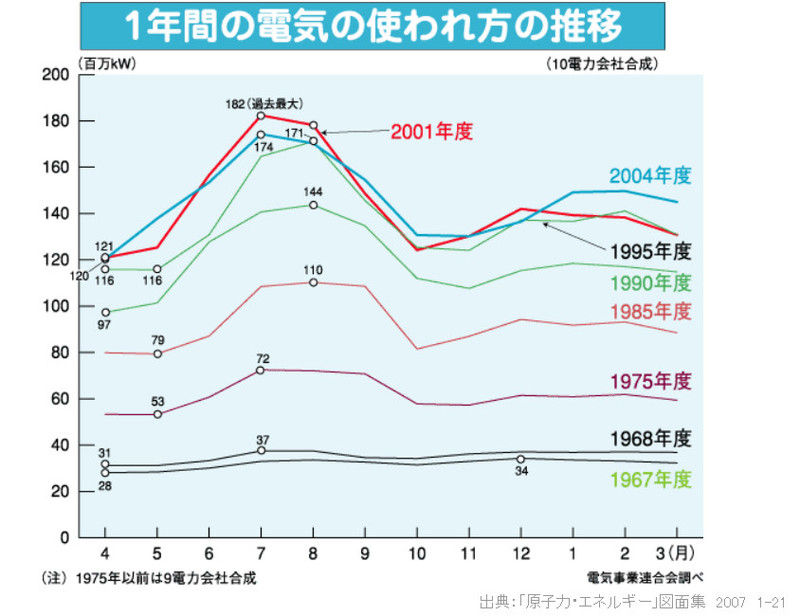 まず、このグラフを見ると、夏場の電気消費量が上がり始めたのは1985年ぐらいだが、そのときの電力消費量は現在の半分ぐらいだから、1985年の生活に戻ればまったく問題が無い。それがまず電力消費を考えるときの基本だ。