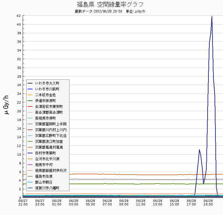2012年06月29日 緊急情報 福島4号機の作業で放射性物質漏洩か? 福島のどこか(場所がまだ確定できないが付近と思われる)の線量が急増し、1時間に40マイクログレー(ほぼ40マイクロシーベルト)に達した。 おそらく福島4号機のはつり作業(燃料取りだしのための仮の建てや建設のためと考えられる)の時の放射性粉塵のためと考えられる。 また情報が入ればブログに出しますが、テレビ、新聞が報じない可能性がありますので、伝えます。場所がわかり次第、情報を出しますが、原発のごく近く(10キロ)以外の場所の人はまだ退避は不要でしょう。 (平成24年6月29日 朝) 「■■■■ 速報やお答え」カテゴリの最新記事 < 前の記事次の記事 >