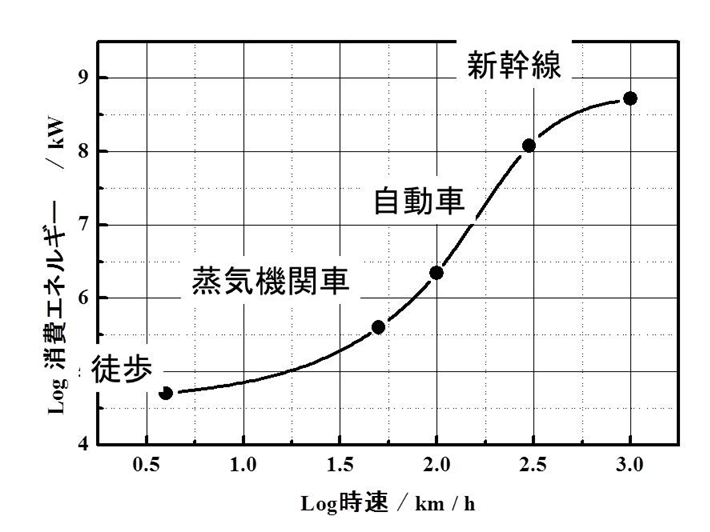 このグラフはやや専門的ですが、およそ輸送に関係している技術者なら誰でも知っていることです。横軸が移動速度の対数、縦軸がエネルギー消費量で、移動速度が10倍になると、消費されるエネルギーは100
