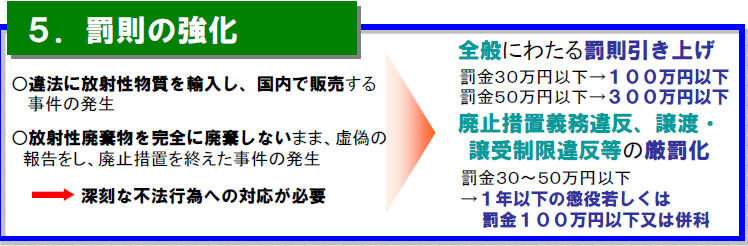 これは1キロ100ベクレルを超えるものを扱った事例が多いので、罰則を強化したときの文科省の説明文です。「深刻な不法行為への対応」ということで、罰則が引き上げられています。