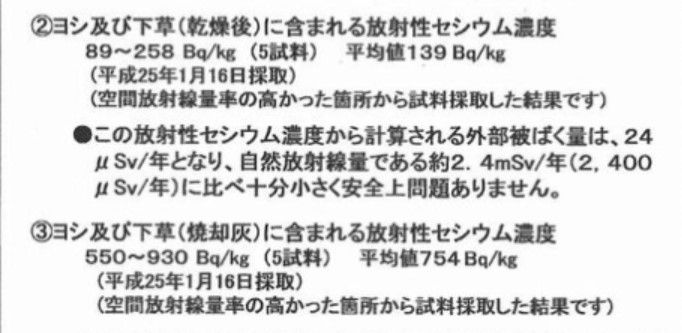 データは、下に測定値を示しましたが、葦の放射性セシウム濃度が1キログラムあたり平均139ベクレル、最高で259ベクレルです。法令では1キロ100ベクレル以上のものは「放射性物質」として勝手に扱うことはできず、もし扱えば「懲役刑」になります。