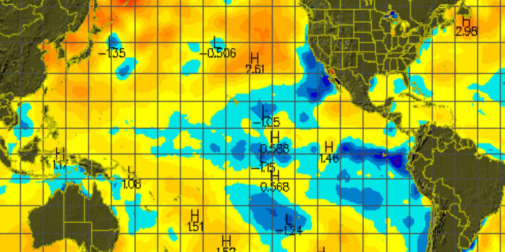 今年の猛暑は、第一に都市化、第二に高気圧の配置、第三に地球全体の温暖化(太陽活動など)によるもので・・・お知り合いの先生から次のデータをお送り頂きました。今年はペルー沖の温度が低く、太平洋全体では日本の周辺の海水温が高いようです。(この部分を追加しました)