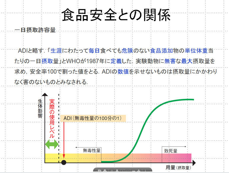 この図はそれをよく示しているが、ADIという概念があり、動物実験などで求められた無毒量を基準にしてその100分の1をもって「生涯にわたって毎日食べても危険がない食品添加物の単位重要あたりの一日摂取量」と定義されている.