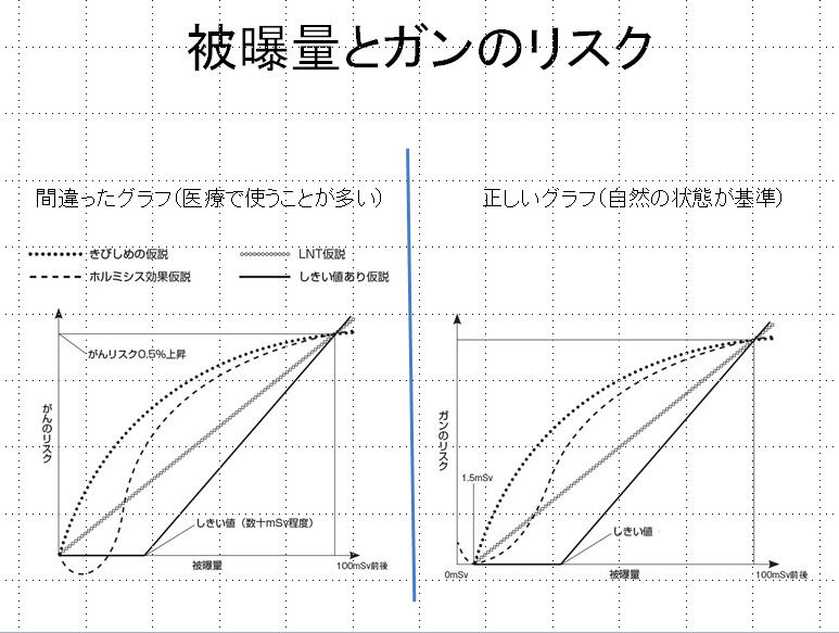 ここに示した図は被曝と健康障害について良く使用される図だが、左の図はもともと間違っている.地上に住んでいる限り、被曝量がゼロということはなく、従って、被曝量がゼロの時にガンのリスクがゼロになるということは科学的には不明である.