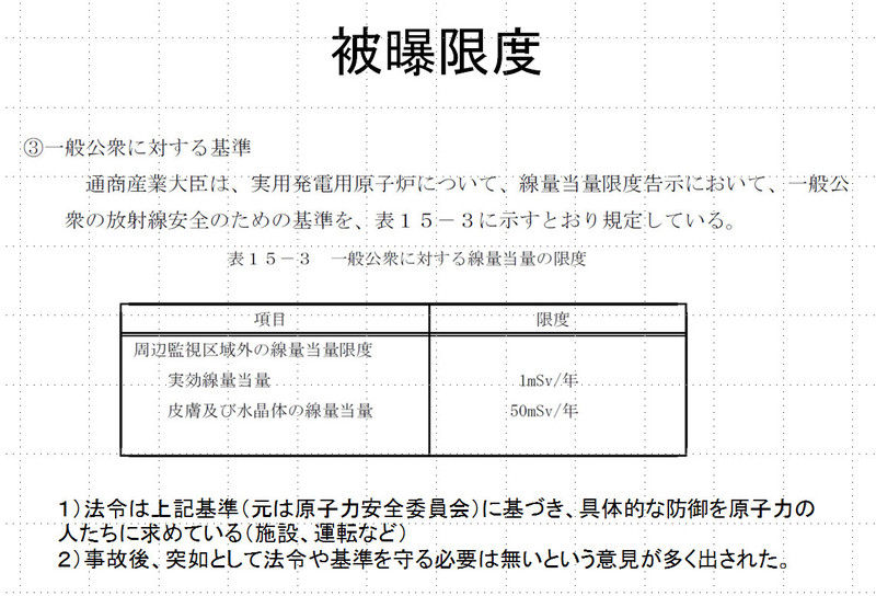 事故後、混乱した一つの原因は、1年1ミリというのは「受け手(原子力を扱っていない人)」の限度だから、それを守るために求めるのは原子力関係機関であり、そこには1年1ミリが明示されず「1年1ミリを超える被曝をしないための、装置、設計、運転、管理などが求められる」ということがあったのではないかと思う。でも関係者はすべて知っている事でもある.