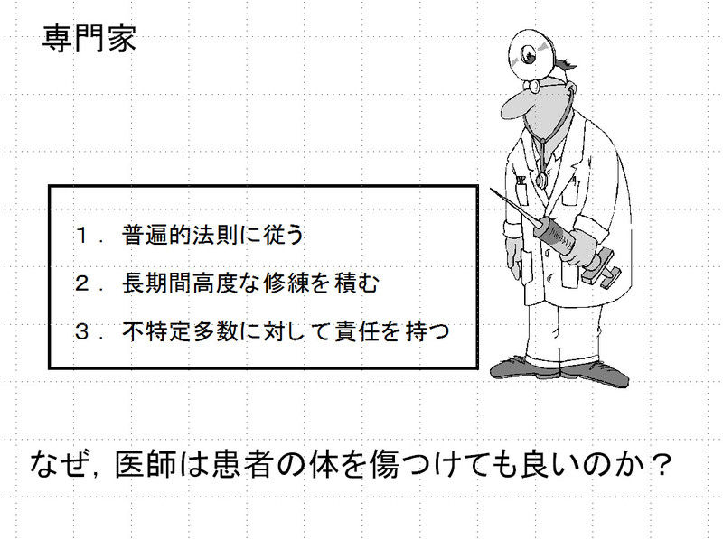 一つはこの図に示したように、普遍的法則、たとえば医学に基づき、長期間高度な修練を積むということで、それによって「普遍的であり、一般人とは違うレベルにある」ということが確定する.医師では医学に従い、6年制の大学を卒業して医師試験に合格し、さらに2年から5年の研修期間を終えるのだから、一般人よりかなり高い専門性を有することになる.