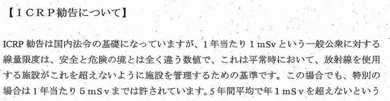 また「ICRP勧告は国内法令の基礎になっている」とありますが、その通りです。「被曝」というのは民族や国家を超えた問題なので、世界的に「ICRPの勧告」によっていること、それが「国内法令」になっていることを示しています。事故後に「ICRPの値はあるが、法令はない」などと言った人もいますが、ICRPはあくまで国際的な歩調を合わせるためで、独立国家ですから、自分の国の法律以外に束縛されるものはありません。