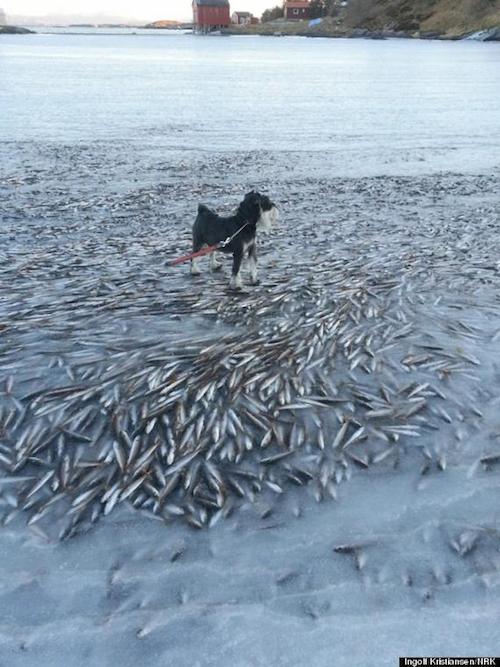 第二に、寒いことだ。これは全世界的にそうで、アメリカ、日本、ヨーロッパ、南極が特に寒い。この写真はノルウェーの海が凍って、海の中のサカナも一緒に冷凍されてしまったもので、寒波は相当なものだ。