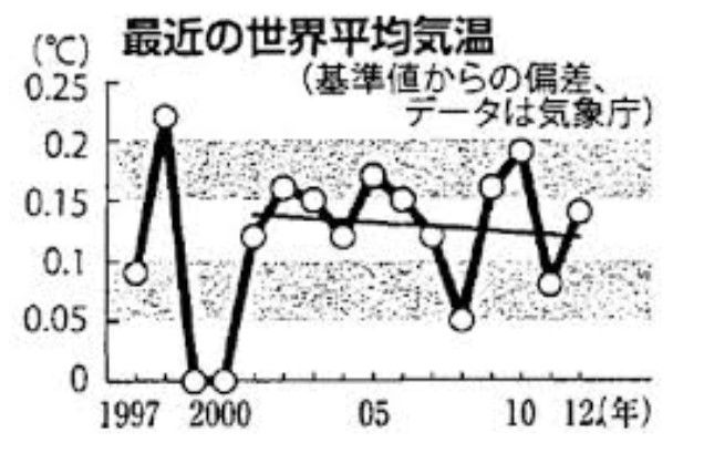 世界の気温が上がっていないのは、2013年に渡辺正先生が北海道新聞に掲載したこのグラフでも良く分かるが、ここ15年、世界の気温はまったく上がっていない。気象予報士の多くはこのデータを言わないが、もし「温暖化」が話題になった時には「15年は気温が上がっていない」ということを一言言わなければ詐欺師の部類になってしまうので、注意を要する。
