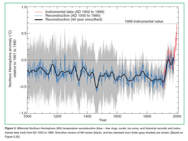 この図は「過去にないような気温変化があり、それはCO2が原因だ」という大きな根拠になり、それが日本でも新聞などで紹介され、この考え方や計算に基づき、IPCCは「気温が変化する原因の95%はCO2だ」という立場を取り、それが日本ではNHK、朝日新聞などが報道して世論を作り、温暖化に関係する税金や補助金、団体が多くできた。