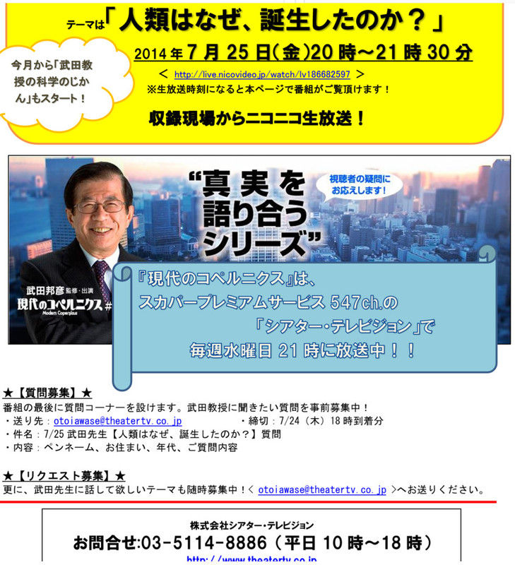 2014年07月19日 ニコニコ生放送(シアターテレビジョン)ご案内 7月25日金曜日午後8時から、「人類はなぜ、誕生したのか?」を放送します。 「14070725.pdf」をダウンロード (平成26年7月 19日) 「■■■■ 速報やお答え」カテゴリの最新記事 < 前の記事次の記事 >